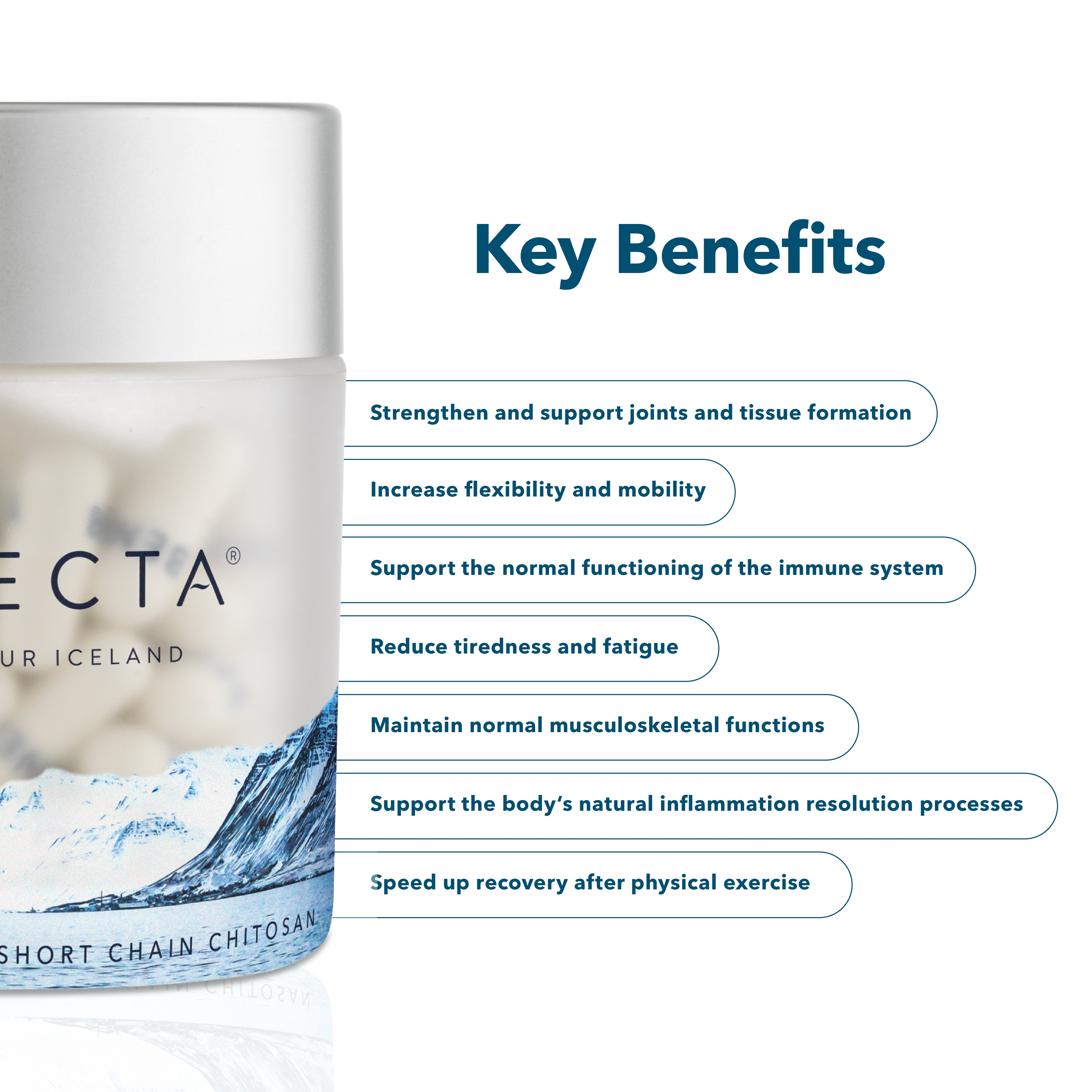 Benecta's unique Chitosan-based formula helps to strengthen and support joint and tissue health, enhancing structural integrity and function.